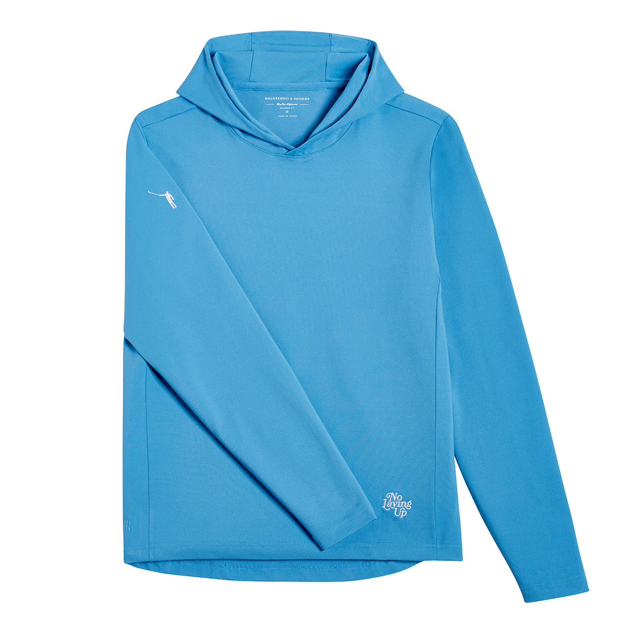 The Jackson is a lightweight performance hoodie cut from one of the softest performance fabrics we have ever developed. Less is more when it comes to golf hoodies. This style is an exceptionally comfortable modern classic featuring a streamlined and stylish design with no extraneous drawstrings or pouches. This version is in Sankaty blue with our Friendly Skies script wordmark on the bottom left hem and a wayward drive on the right sleeve. both in white. There's also a tonal HB logo on the right-side panel.