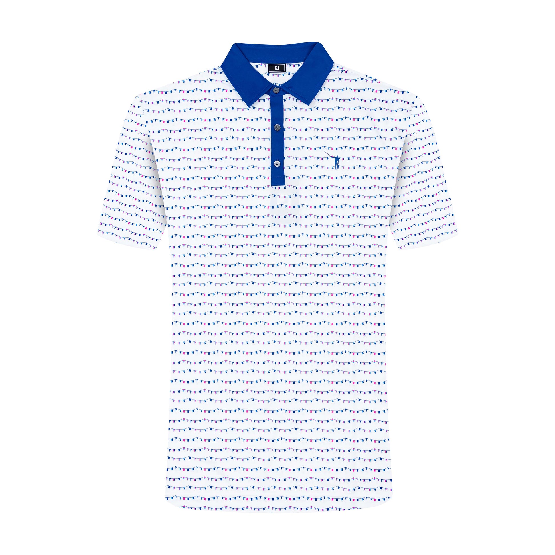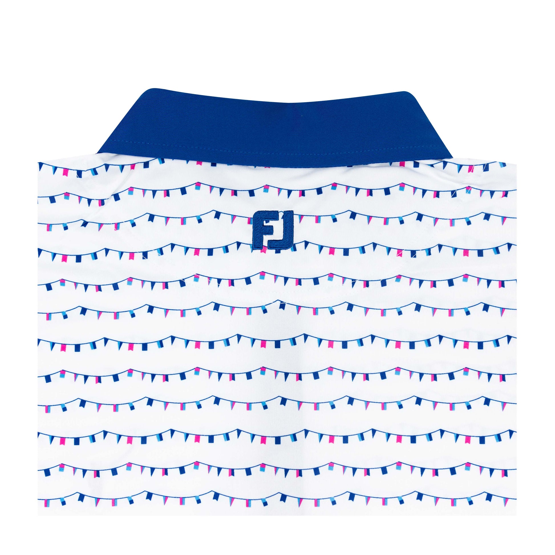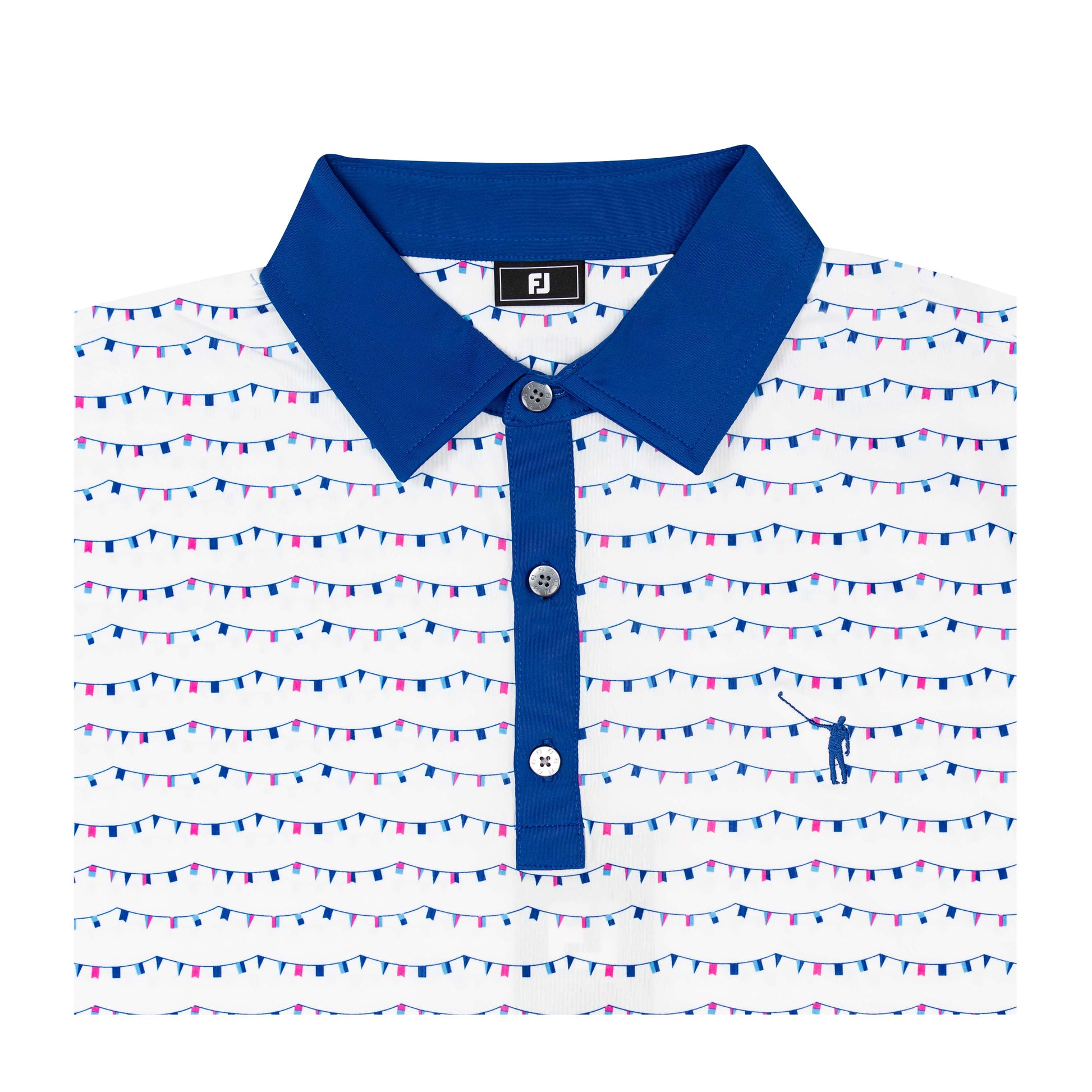 It's a party with this NLU x FJ Banner Print Polo featuring an all-over multi-colored print on a white background with a Deep Blue contrast placket and collar.