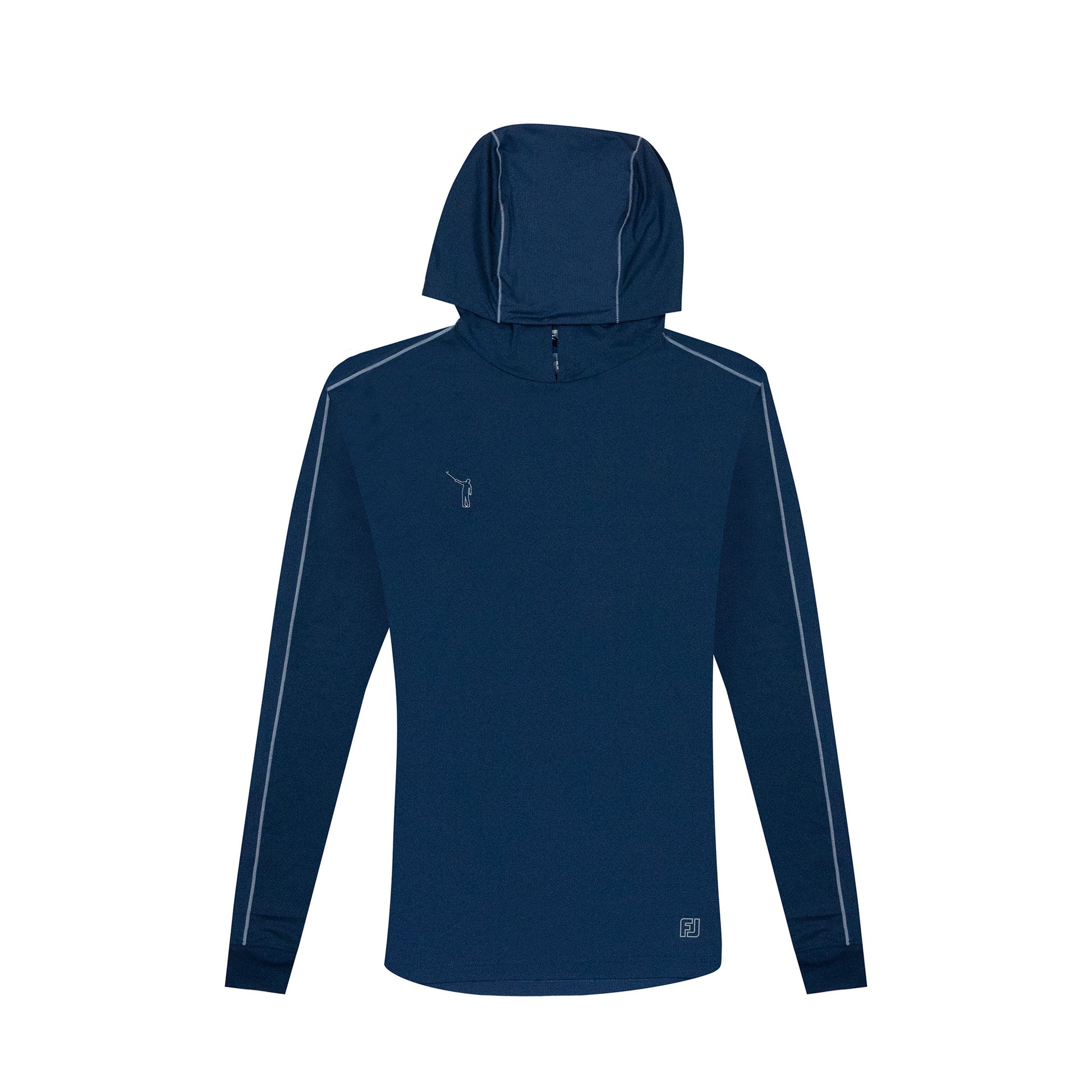 This sleek hoodie does more than look good; it helps to shield you from the sun's harmful rays with 50+ UPF fabric. The crossover hood has no drawstring to get in your way while swinging. The hoodie is made of 2 different blocked fabrics to help you shield that sun while still staying cool.
