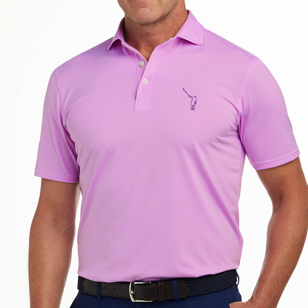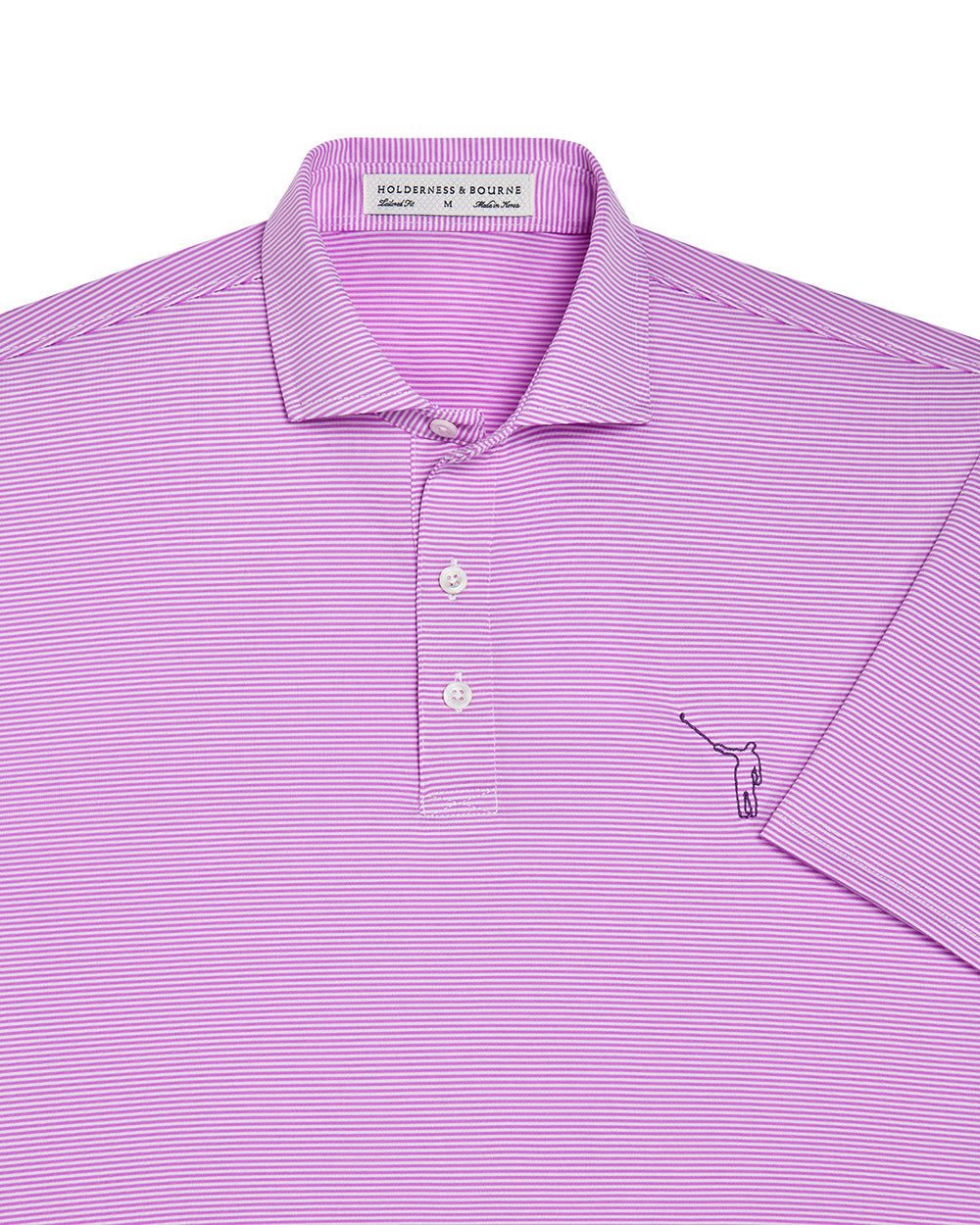 Finished with H&B's signature structured spread collar, genuine trocas shell buttons, and tailored fit, this version features Thistle purple and white stripes accented with our Wayward Drive Outline logo on the chest and a NLU monogram on the back yoke, both in tonal purple.