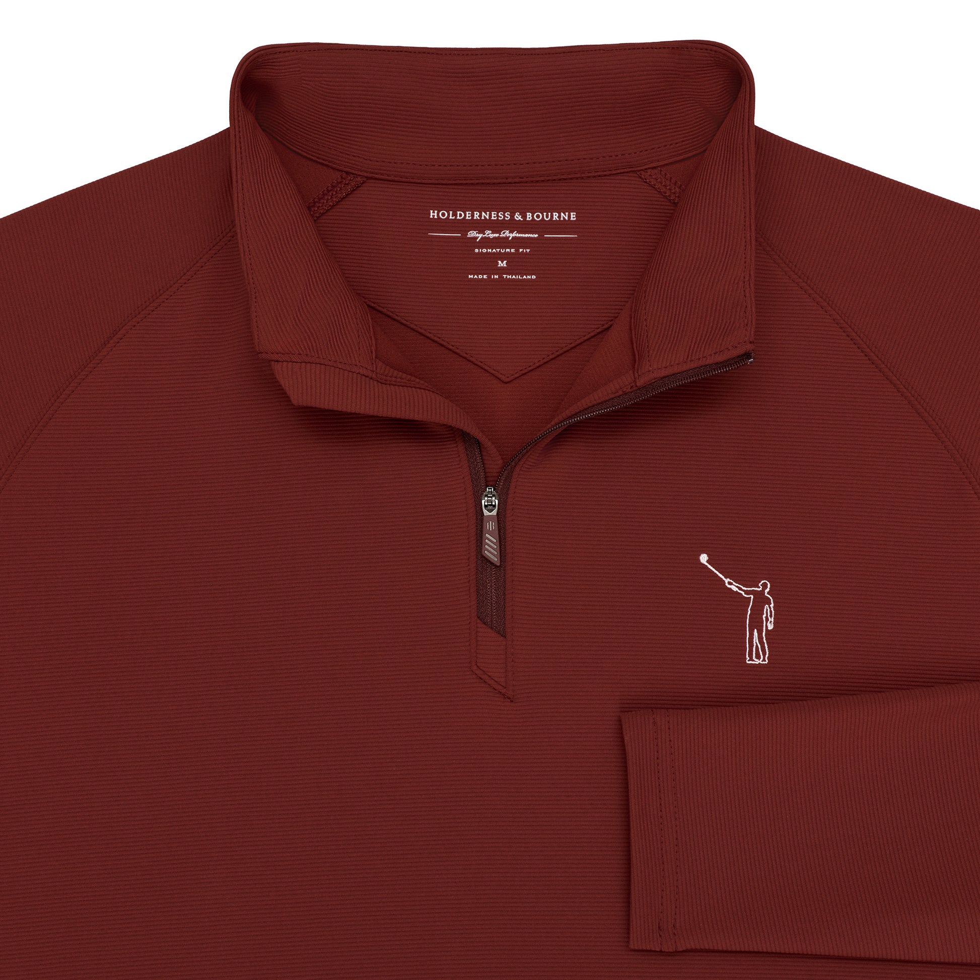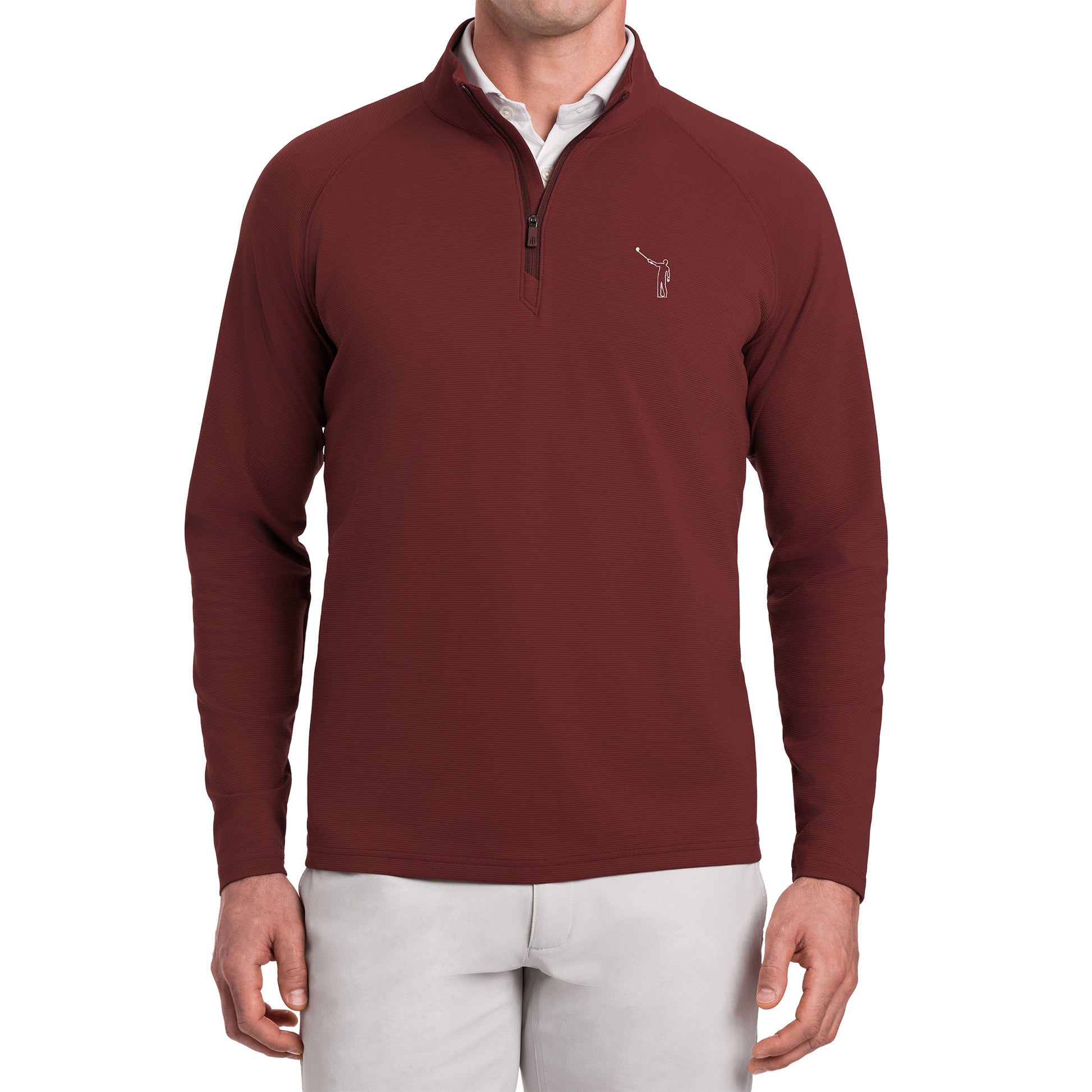 Get ready for chilly fall mornings with this lightweight performance quarter zip featuring a subtle ribbed texture. The Stuart, sewn from a luxurious performance blend treated for superior interior softness, features UPF 50+ sun protection, moisture wicking, and 4-way stretch. The Exeter red pairs well with changing leaves and drinks around a fire. We've adorned this with a white Wayward Drive outline on the left chest.