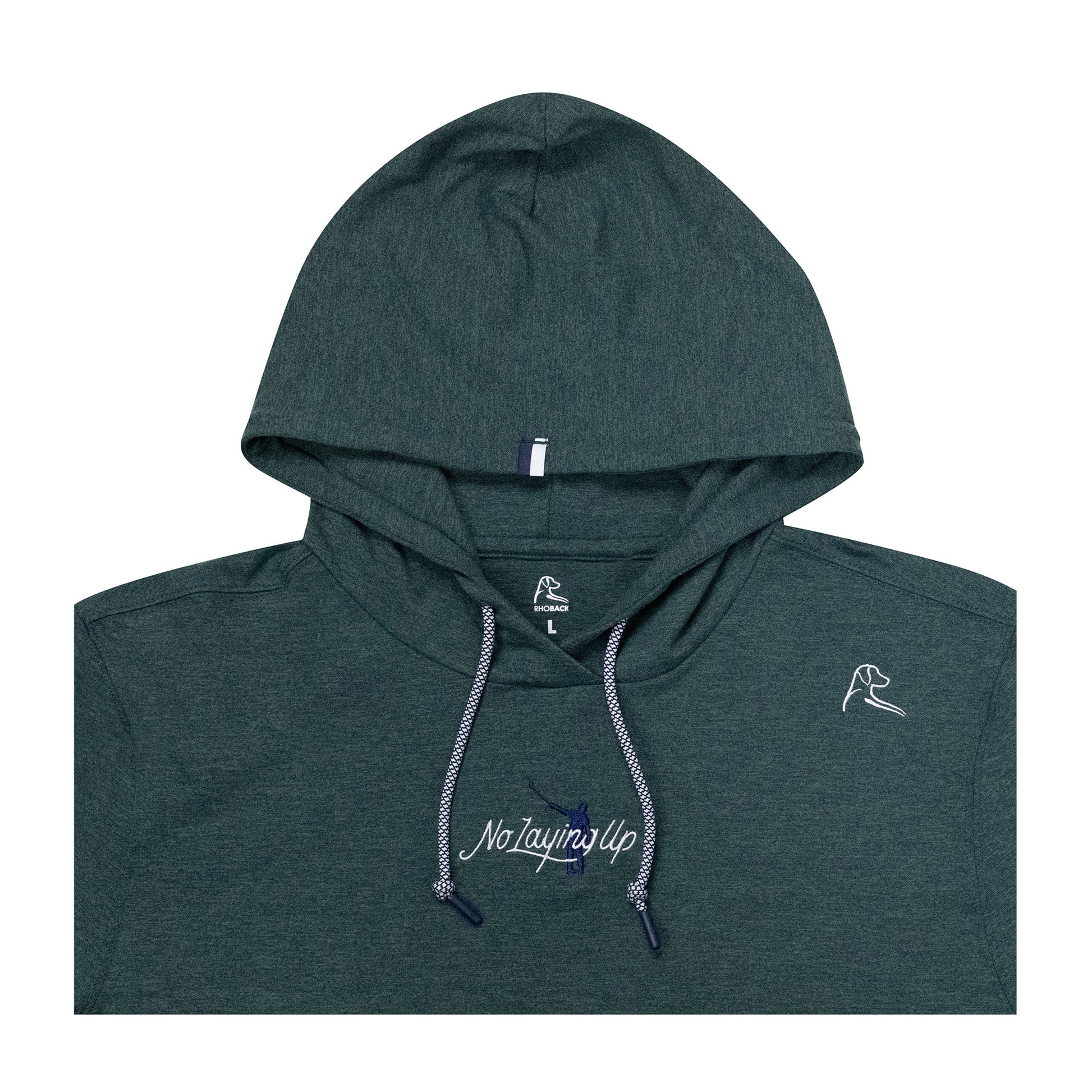Brighten up your spring with this heathered green hoodie from NLU and Rhoback. This limited edition piece is Rhoback's Hesi Hoodie in ponderosa green, built with 4-way stretch fabric. It sports a white and navy embroidered No Laying Up lock-up logo on the center chest and a subtle dog logo on the left front shoulder.