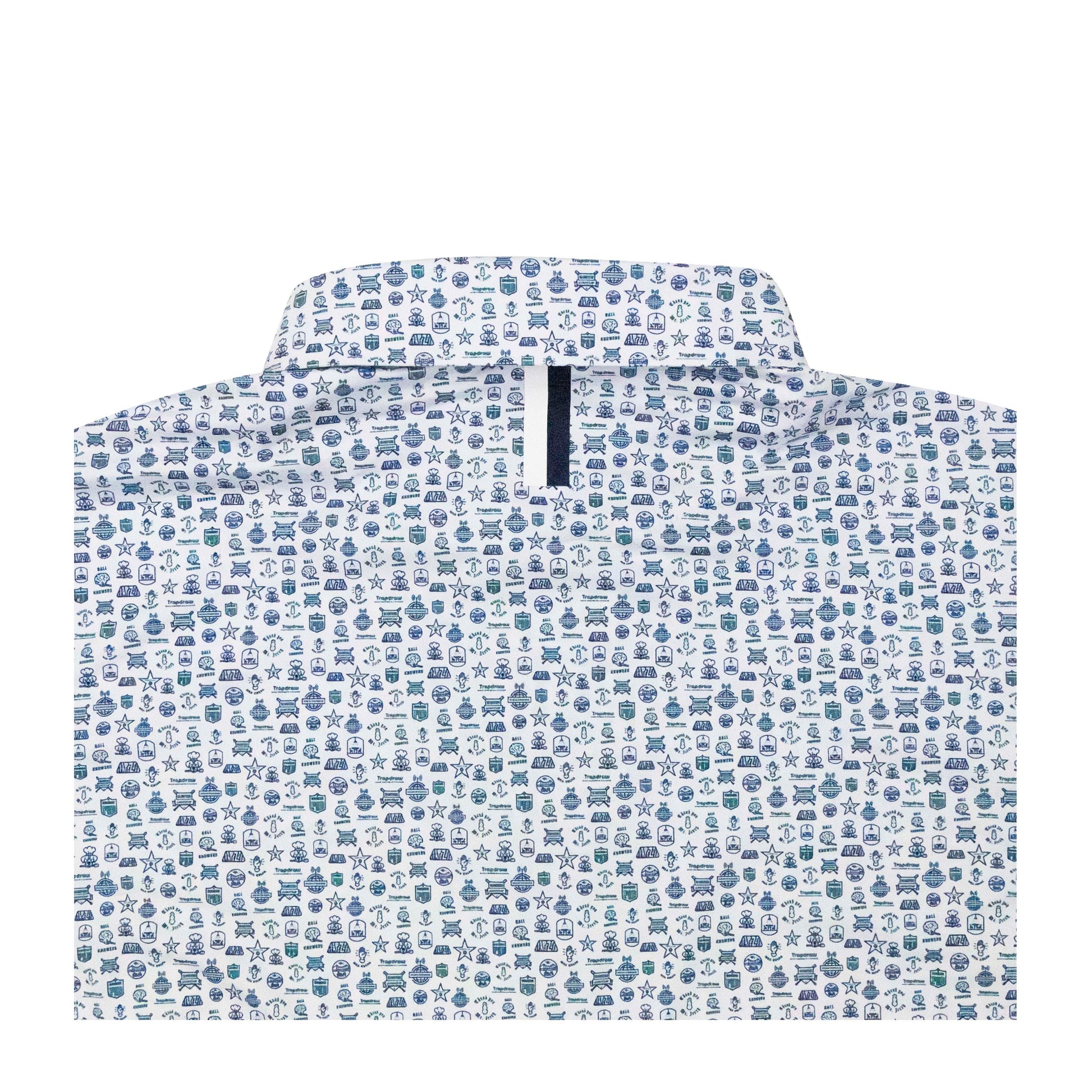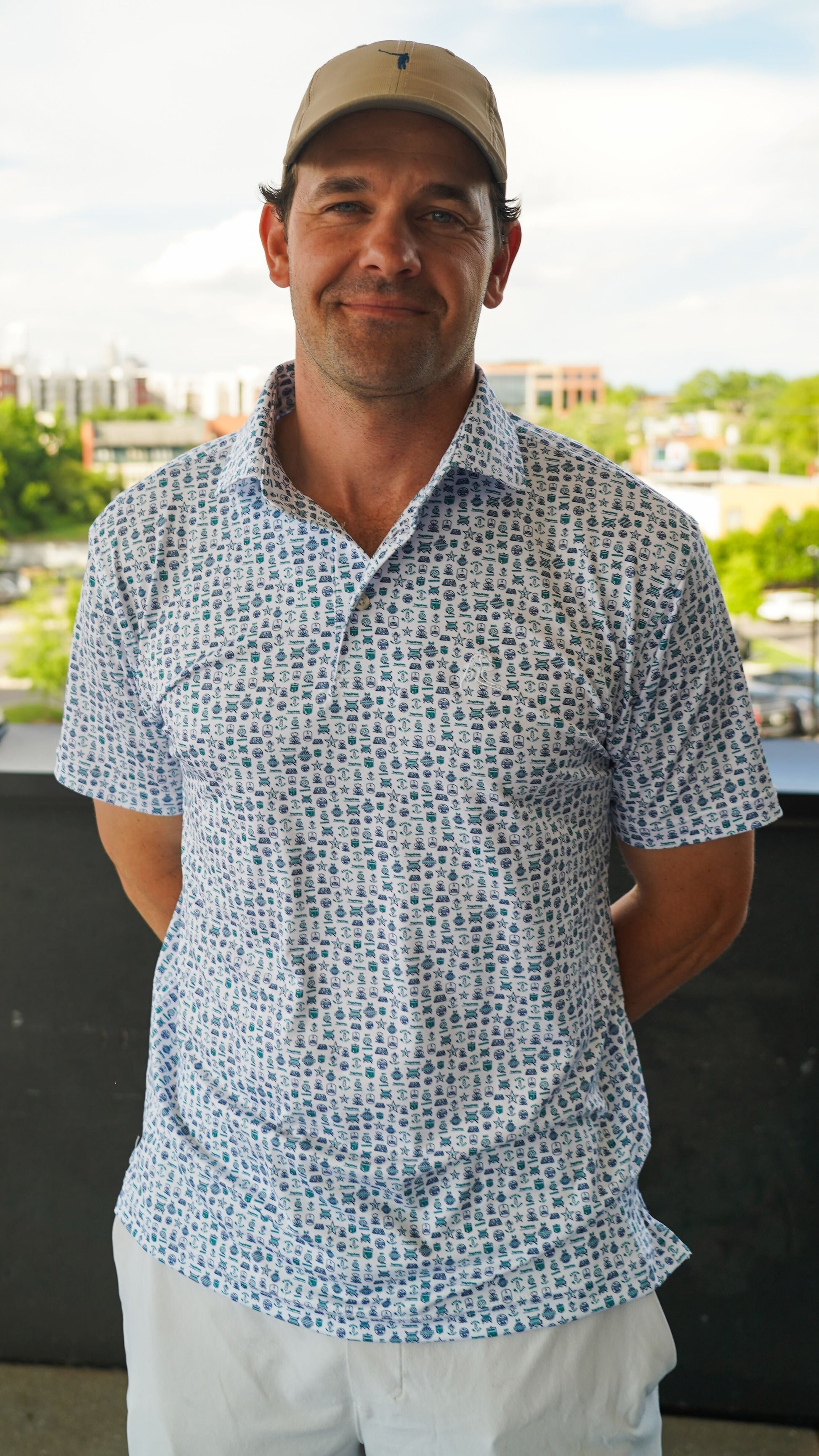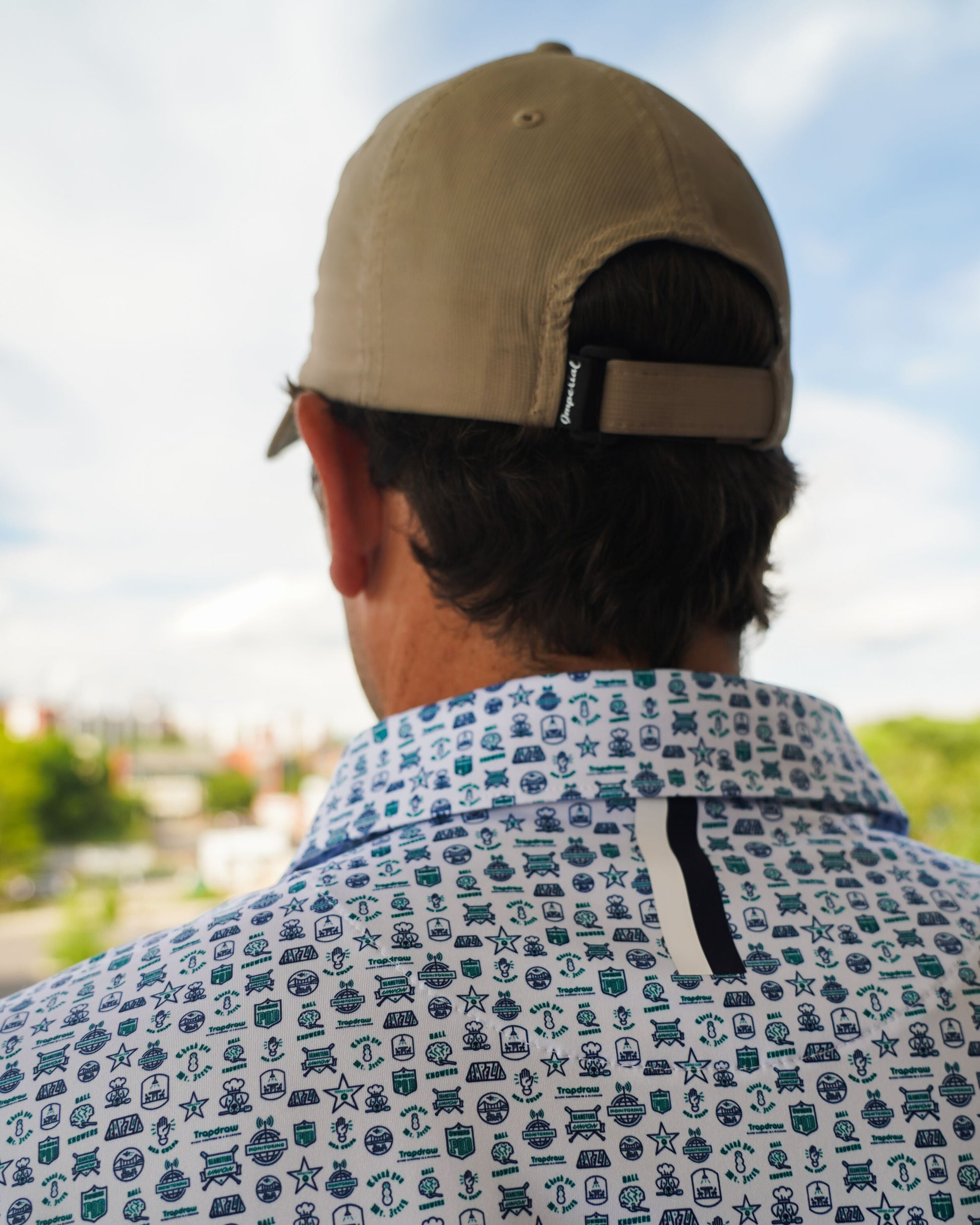 The TrapDraw - it's a bit of everything, and we've made a custom polo with Rhoback to celebrate all things TD! Chop sessions, BallKnowers, logistics, perfect clubs, The Booth, air travel, and more! Rhoback does such a good job at these intricate prints, and we love how this came out. On a white base with navy and dark green TrapDraw icons all over, this polo is sure to be a talking point during your next round.