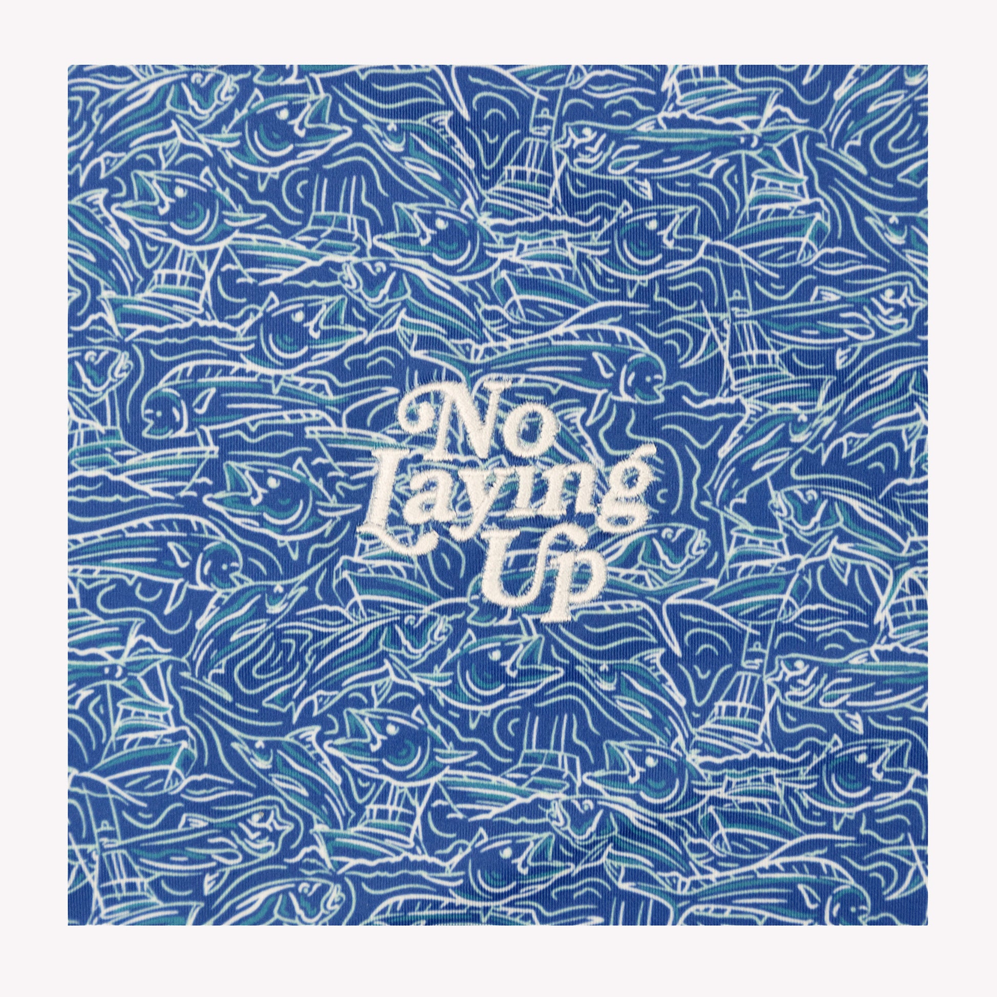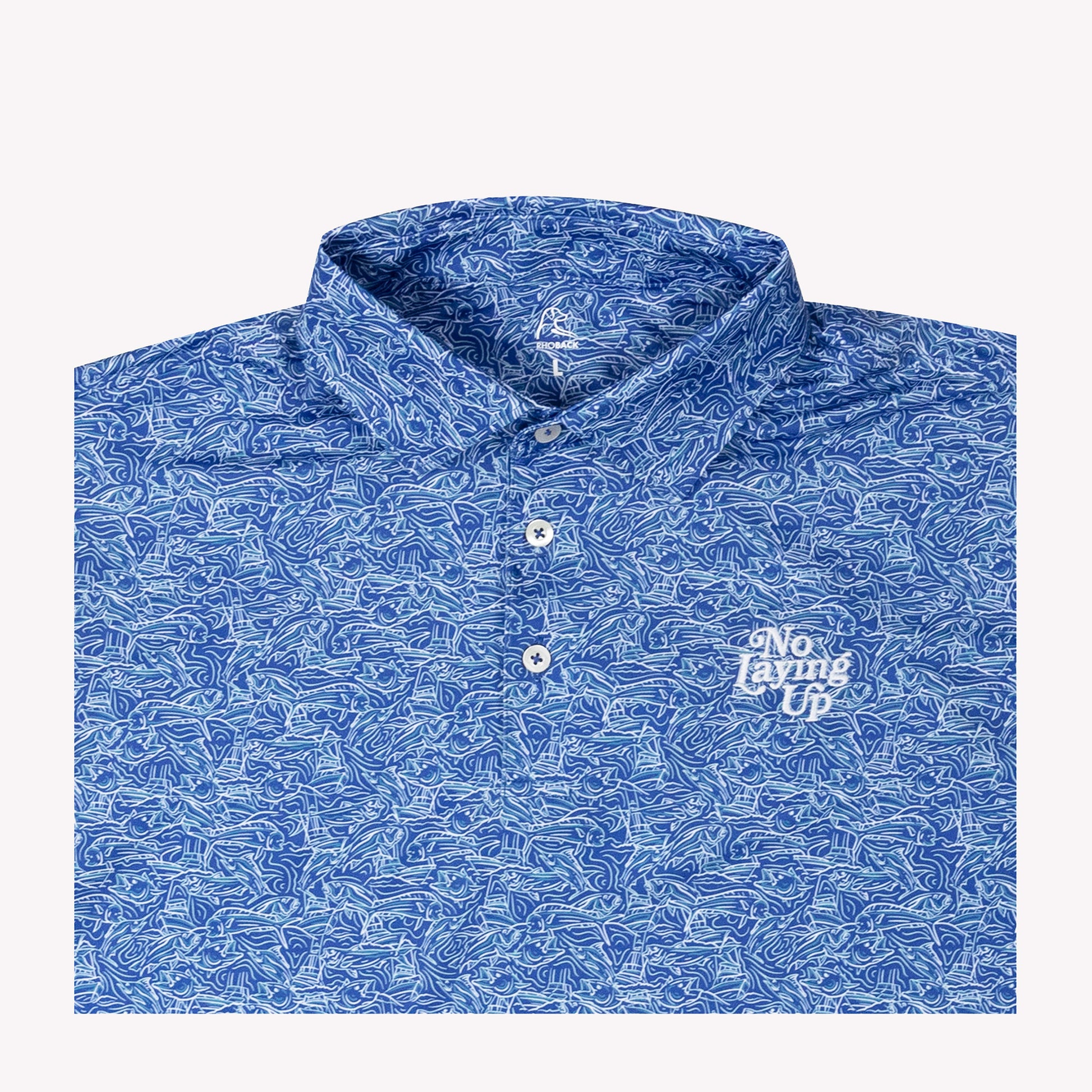 Performance meets style with the incredibly comfortable Rhoback Deep Sea Performance Polo. A blue base is the perfect backdrop for this abstract fish print. Our No Laying Up Friendly Skies logo is featured on the left chest, embroidered in white, and a Rhoback Ridge ties it all together on the back.