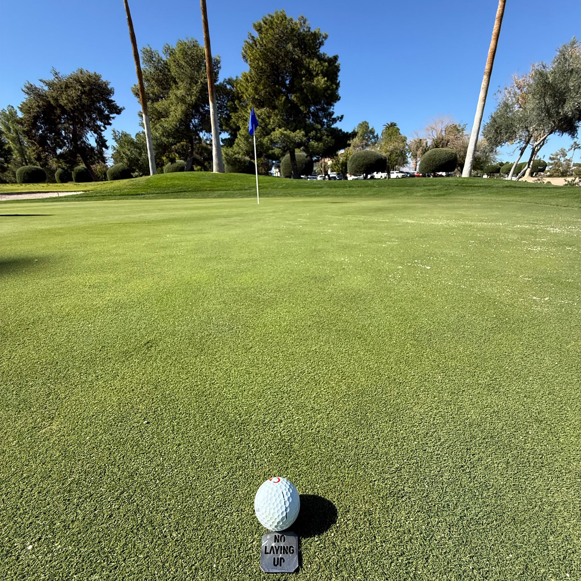 We collaborated with our friends at Seamus to create these distinctive square steel ball markers featuring a No Laying Up cutout in the middle.