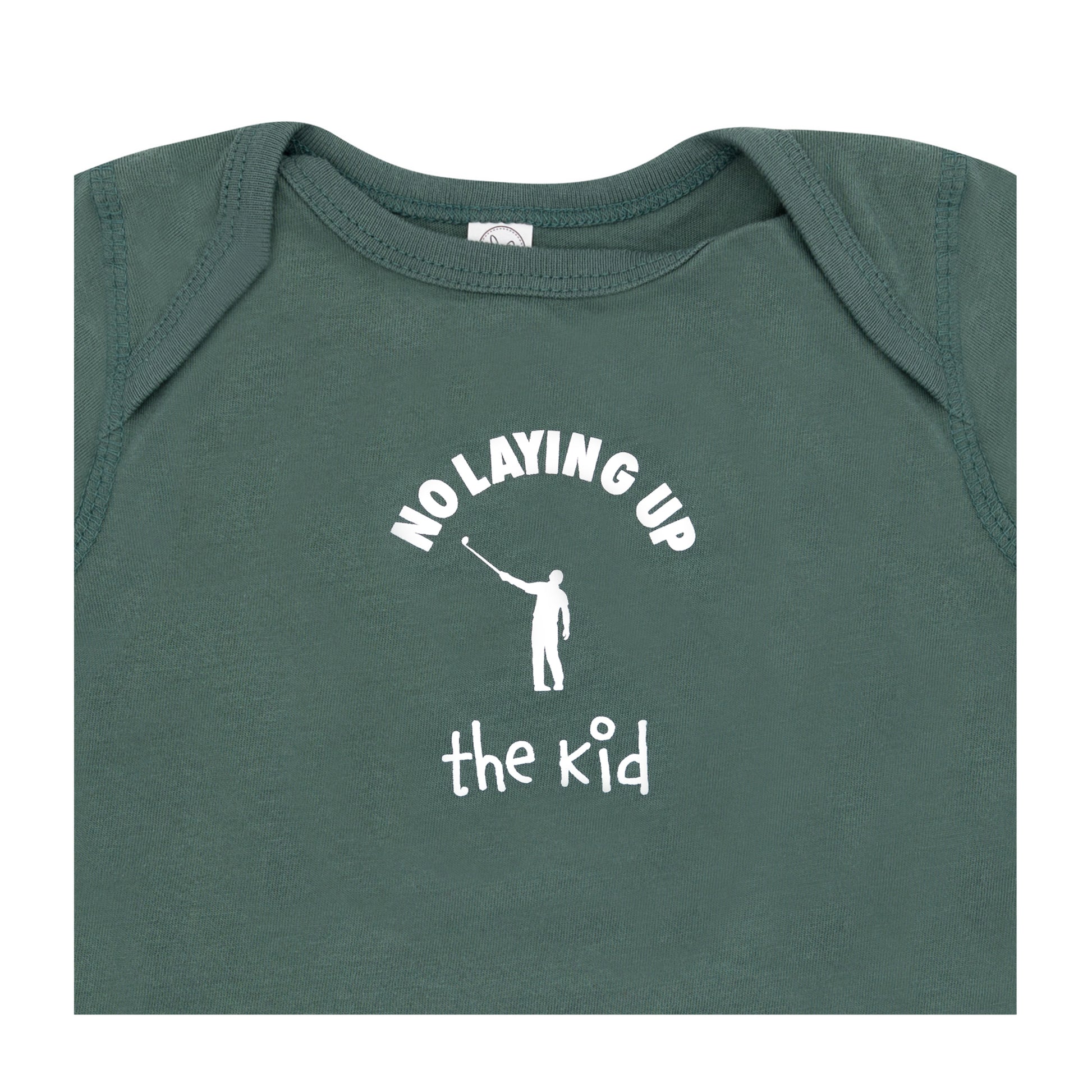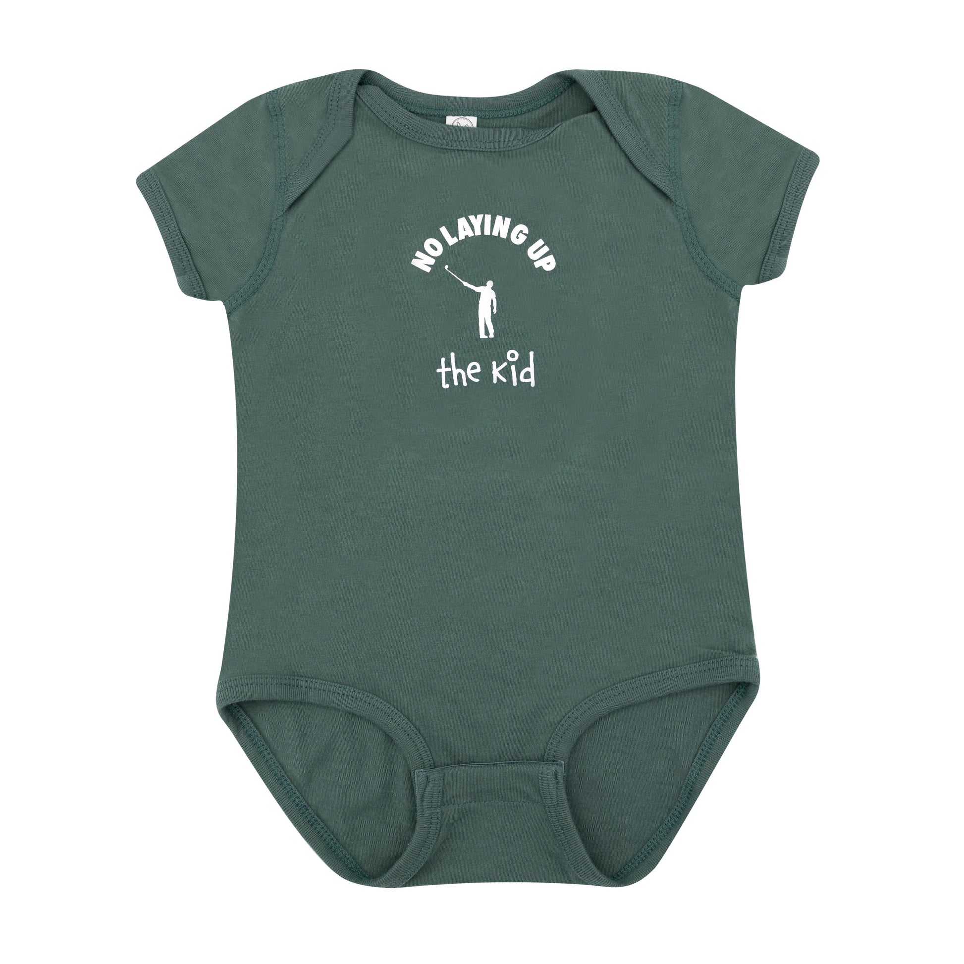 When the Merch Czar has a baby, we get baby merch made! Introducing the No Laying Up "The Kid" baby onesie for the kid in your life. In gender-neutral basil green with white printing, this is bound to be a go-to gift for golf sicko new parents.