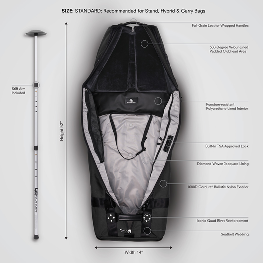 This is a standard size bag, recommended for stand, hybrid & carry bags. It has two interior pockets for organization and includes a stiff arm for added club protection in transit.